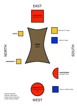 Les rituels védiques sont généralement exécutés par quatre prêtres : l’adhvaryu qui est responsable des détails matériels du sacrifice et chante le Yajurveda, un hotṛi qui récite le Rigveda, un udgātṛi qui chante les hymnes du Samaveda et un brahman qui supervise la cérémonie et récite l'Atharvaveda tout en corrigeant les erreurs qui peuvent survenir. Il y a trois feux : un feu offert à l'est appelé āhavanīya allumé dans un brasero carré, un feu à l'ouest appelé le gārhapatya allumé dans un brasero circulaire, qui représente le feu du maître de maison, et un feu au sud simplement appelé le dakṣiṇāgni (feu du sud). Pendant les cérémonies, un tisonnier, un pot appelé agnihotrasthālī, une cuillère connue sous le nom de sruva et une grande louche appelée agnihotrahavani sont tous utilisés. Au centre de l'espace rituel se trouve un autel en terre appelé le vedi, où sont placés les outils pour effectuer le rituel[7].