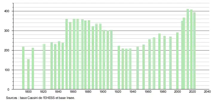 - ↑ Fiches Insee - Populations de référence de la commune pour les années 2006, 2007, 2008, 2009, 2010, 2011, 2012, 2013, 2014, 2015, 2016, 2017, 2018, 2019, 2020, 2021 et 2022.