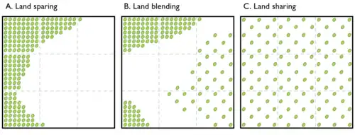 - ↑ (en) Joern Fischer, David J. Abson, Van Butsic et M. Jahi Chappell, « Land Sparing Versus Land Sharing: Moving Forward », Conservation Letters, vol. 7, no 3, , p. 149–157 (ISSN 1755-263X, DOI 10.1111/conl.12084, lire en ligne, consulté le ).