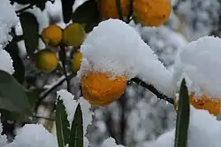 Citron sous la neige. Le citronnier n'est pas un agrume rustique, il préfère les zones littorales méditerranéennes.
