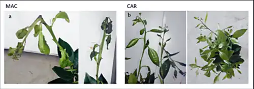 Pousses endommagées d'orange Valencia greffée sur C. macrophylla (MAC) et indemnes sur Citrange Carrizo (CAR) à 0°C pendant 30 jours.