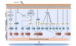 Tolérance au froid des agrumes. Les membranes atteintes déclenchent l'accumulation de Ca 2+ détectée par les protéines de signalisation. Les facteurs de transcription (rectangles jaunes), agissent sur les gènes sensibles au froid (rectangles bleus)[5].