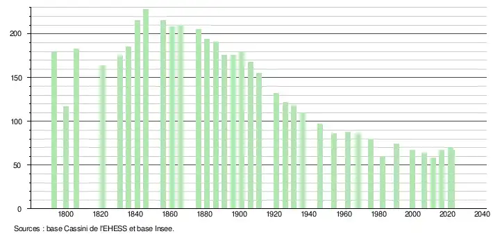L'évolution du nombre d'habitants est connue à travers les recensements de la population effectués dans la commune depuis 1793. Pour les communes de moins de 10 000 habitants, une enquête de recensement portant sur toute la population est réalisée tous les cinq ans, les populations de référence des années intermédiaires étant quant à elles estimées par interpolation ou extrapolation[29]. Pour la commune, le premier recensement exhaustif entrant dans le cadre du nouveau dispositif a été réalisé en 2006[30].