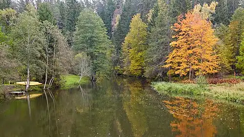 Au milieu de la rivière se trouve la réserve paysagère de la rivière Ahja, créée pour protéger les affleurements de grès du Dévonien, plusieurs grottes, la vallée fluviale et les espèces protégées qui s'y trouvent. Les affleurements les plus célèbres de cette région sont Väike Taevaskoda et Suur Taevaskoda.