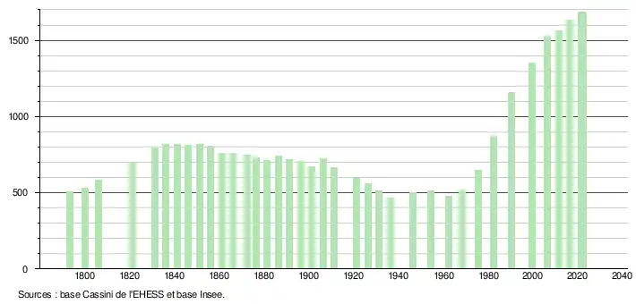 L'évolution du nombre d'habitants est connue à travers les recensements de la population effectués dans la commune depuis 1793. Pour les communes de moins de 10 000 habitants, une enquête de recensement portant sur toute la population est réalisée tous les cinq ans, les populations de référence des années intermédiaires étant quant à elles estimées par interpolation ou extrapolation[17]. Pour la commune, le premier recensement exhaustif entrant dans le cadre du nouveau dispositif a été réalisé en 2006[18].