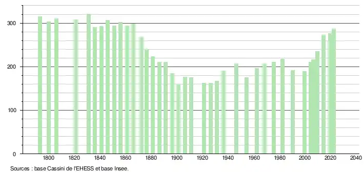 L'évolution du nombre d'habitants est connue à travers les recensements de la population effectués dans la commune depuis 1793. Pour les communes de moins de 10 000 habitants, une enquête de recensement portant sur toute la population est réalisée tous les cinq ans, les populations de référence des années intermédiaires étant quant à elles estimées par interpolation ou extrapolation[31]. Pour la commune, le premier recensement exhaustif entrant dans le cadre du nouveau dispositif a été réalisé en 2004[32].