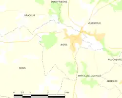 Les principaux hameaux sont : l'Ouche et Saint-Méxant au nord-ouest, et la commune ne compte que quelques fermes isolées comme la Combe et Cessac, ainsi que le lotissement de la Broussette et le château de Crève-Cœur à l'ouest. Au sud-est, la Servanterie, la zone du collège du Renclos et Aizet en limite avec Marcillac-Lanville sont quasiment collés au noyau urbain[5].
