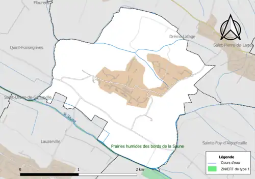 L’inventaire des zones naturelles d'intérêt écologique, faunistique et floristique (ZNIEFF) a pour objectif de réaliser une couverture des zones les plus intéressantes sur le plan écologique, essentiellement dans la perspective d’améliorer la connaissance du patrimoine naturel national et de fournir aux différents décideurs un outil d’aide à la prise en compte de l’environnement dans l’aménagement du territoire. Une ZNIEFF de type 1[Note 2] est recensée sur la commune[16] : les « prairies humides des bords de la Saune » (47 ha), couvrant 5 communes du département[17].