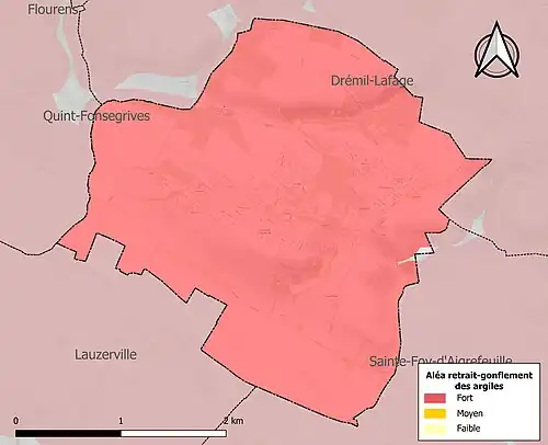 Le retrait-gonflement des sols argileux est susceptible d'engendrer des dommages importants aux bâtiments en cas d’alternance de périodes de sécheresse et de pluie. 99,9 % de la superficie communale est en aléa moyen ou fort (88,8 % au niveau départemental et 48,5 % au niveau national). Sur les 429 bâtiments dénombrés sur la commune en 2019, 429 sont en aléa moyen ou fort, soit 100 %, à comparer aux 98 % au niveau départemental et 54 % au niveau national. Une cartographie de l'exposition du territoire national au retrait gonflement des sols argileux est disponible sur le site du BRGM[22],[Carte 3].