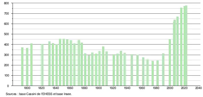 L'évolution du nombre d'habitants est connue à travers les recensements de la population effectués dans la commune depuis 1793. Pour les communes de moins de 10 000 habitants, une enquête de recensement portant sur toute la population est réalisée tous les cinq ans, les populations de référence des années intermédiaires étant quant à elles estimées par interpolation ou extrapolation[26]. Pour la commune, le premier recensement exhaustif entrant dans le cadre du nouveau dispositif a été réalisé en 2005[27].