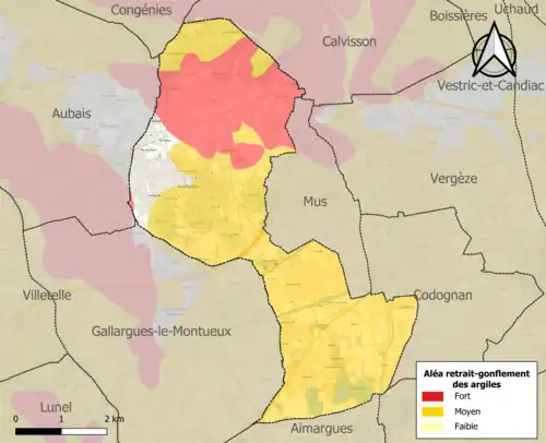 Le retrait-gonflement des sols argileux est susceptible d'engendrer des dommages importants aux bâtiments en cas d’alternance de périodes de sécheresse et de pluie. 92,7 % de la superficie communale est en aléa moyen ou fort (67,5 % au niveau départemental et 48,5 % au niveau national). Sur les 1 371 bâtiments dénombrés sur la commune en 2019, 854 sont en aléa moyen ou fort, soit 62 %, à comparer aux 90 % au niveau départemental et 54 % au niveau national. Une cartographie de l'exposition du territoire national au retrait gonflement des sols argileux est disponible sur le site du BRGM[23],[Carte 2].