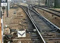 - la partie où se croisent les voies est appelée le cœur. Au niveau du cœur, on trouve un contre-rail (en noir) destiné à guider l'intérieur des roues.