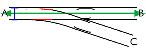 Un aiguillage peut être pris en pointe voie directe (A → B), en pointe voie déviée (A → C) ou en talon (B ou C → A).