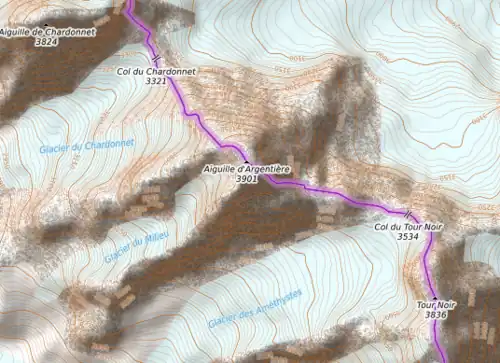 | Voie la plus facile | Versant Sud-Ouest par le glacier du Milieu depuis le refuge d'Argentière (PD+) | ||||