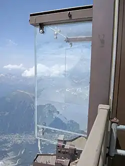 Une cage en verre transparente suspendue sur la paroi, dénommée le « pas dans le vide », a été ouverte au public le , permettant de procurer la sensation du vide aux visiteurs, face au mont Blanc, aux aiguilles Rouges et à la chaîne des Aravis. La sécurité est assurée par la société Dania-Vitrage qui a réalisé le projet. La cage vitrée, au sol, au plafond et sur trois faces verticales munies d'un vitrage de 36 mm d'épaisseur, peut supporter 1 500 kg et résiste à des températures de −40 °C et des vents de 220 km/h. La réouverture de l'ensemble d'ascenseurs doubles, de l'accès à la terrasse et du « pas dans le vide » est effective depuis le .