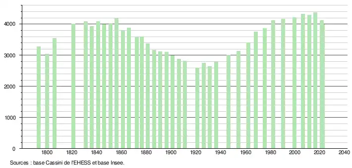L'évolution du nombre d'habitants est connue à travers les recensements de la population effectués dans la commune depuis 1793. Pour les communes de moins de 10 000 habitants, une enquête de recensement portant sur toute la population est réalisée tous les cinq ans, les populations de référence des années intermédiaires étant quant à elles estimées par interpolation ou extrapolation[26]. Pour la commune, le premier recensement exhaustif entrant dans le cadre du nouveau dispositif a été réalisé en 2006[27].