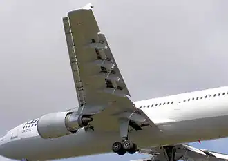 - aérofreins (AF) ou spoilers. Les spoilers peuvent être utilisés asymétriquement (d'un seul côté) pour contrôler le roulis.