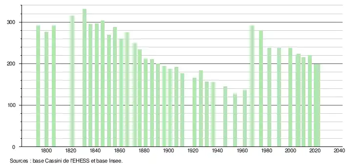 L'évolution du nombre d'habitants est connue à travers les recensements de la population effectués dans la commune depuis 1793. Pour les communes de moins de 10 000 habitants, une enquête de recensement portant sur toute la population est réalisée tous les cinq ans, les populations de référence des années intermédiaires étant quant à elles estimées par interpolation ou extrapolation[23]. Pour la commune, le premier recensement exhaustif entrant dans le cadre du nouveau dispositif a été réalisé en 2005[24].