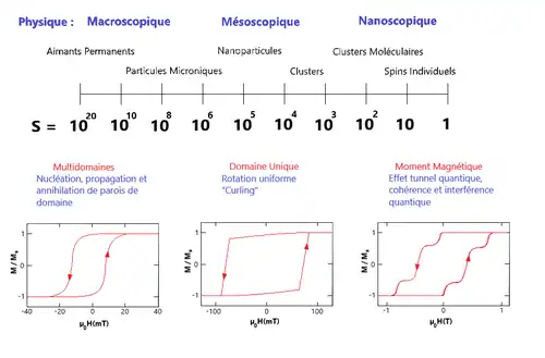 Il existe différentes échelles de taille, allant du macroscopique au nanoscopique, en fonction du nombre de moments magnétiques possédés par la structure. Dans le domaine macroscopique apparaissent les aimants permanents où tous les moments sont bien rangés dans des domaines appelés domaines de Weiss, et séparés par des parois de domaine. Le matériau est alors dit ferromagnétique si tous ces spins magnétiques contribuent positivement à une aimantation nette, ferrimagnétique si une partie des spins se soustrait à l'aimantation nette, ou encore antiferromagnétique si les moments des spins alignés et anti-alignés se compensent complètement. En réduisant maintenant la taille de l'objet, les parois disparaissent progressivement jusqu'à une certaine taille, typiquement de l'ordre d'une dizaine de nanomètres, où la structure est si petite qu'il ne peut plus y avoir de parois. Cette échelle est connue sous le nom de « monodomaine » ou « domaine unique ». Tous les moments magnétiques de la structure sont alors alignés. En réduisant encore la taille du système, passant alors à quelques nanomètres, les moments magnétiques de ce monodomaine deviennent de plus en plus importants et commencent à gouverner les propriétés magnétiques. Si le système est suffisamment petit apparaît un régime quantique. C'est le domaine du spin individuel qui ne peut être décrit qu'au travers de la mécanique quantique[4],[5],[6].