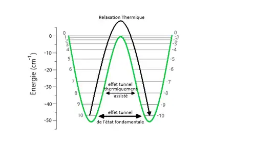 La première est la manière classique : par relaxation thermique. À très faible température, quelques dixièmes de kelvin, seul l'état fondamental d'énergie la plus faible est peuplé. Les phonons donnent accès par agitation thermique aux niveaux d'énergies supérieures. Ainsi une température suffisamment grande permet de traverser la barrière classiquement, soit, d'une façon imagée, sauter au-dessus de cette dernière. Or, comme dit précédemment, la taille de la barrière est proportionnelle au carré du spin total . Donc en augmentant le spin total de la molécule, on augmente la taille de la barrière et on rend ainsi impossible un retournement de l'aimantation à plus haute température, ce qui est souhaité pour stocker de l'information. Ce n'est néanmoins pas simple. En effet, augmenter le spin nécessite l'augmentation de la taille des molécules, ce qui est contraignant en soi car une petite taille est préférable afin de stocker un maximum d'information. De plus, l'augmentation de la taille des molécules entraîne une forte augmentation de la symétrie et donc la perte de leur anisotropie[21], caractéristique essentielle au bon fonctionnement des aimants moléculaires.