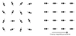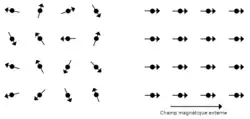 - les matériaux paramagnétiques qui, quand un champ magnétique externe est appliqué, voient les moments magnétiques de leurs électrons s'orienter parallèlement à ce champ. Si on retire le champ magnétique externe, les moments magnétiques reprennent alors une orientation désordonnée[3]. C'est ce phénomène qui est responsable de l'attraction des objets en fer ou en acier (entre autres) par des aimants ;