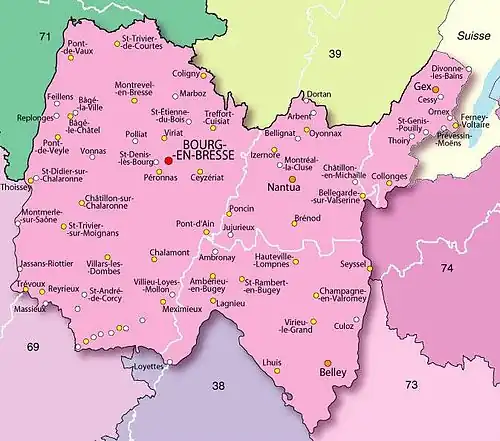 - ↑ Carte du département de l'Ain sur patrimoines.ain.fr