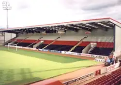 - Lors de la saison 2007–2008 en finale des barrages de montée (défaite 3–0 sur l'ensemble des deux matchs contre Clyde)[41]. Cependant, la relégation administrative de Gretna en Third Division[42], après avoir été mis en redressement judiciaire[43], entraîne une restructuration des championnats, et Airdrie est promu en First Division en tant que finaliste des barrages[44].
