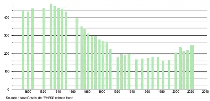 L'évolution du nombre d'habitants est connue à travers les recensements de la population effectués dans la commune depuis 1793. Pour les communes de moins de 10 000 habitants, une enquête de recensement portant sur toute la population est réalisée tous les cinq ans, les populations de référence des années intermédiaires étant quant à elles estimées par interpolation ou extrapolation[23]. Pour la commune, le premier recensement exhaustif entrant dans le cadre du nouveau dispositif a été réalisé en 2005[24].