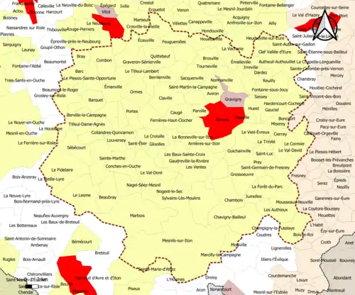 Communes de la couronne Eure 106 Angerville-la-Campagne , Arnières-sur-Iton , Aulnay-sur-Iton , Autheuil-Authouillet , Les Authieux , Aviron , Chambois , Bacquepuis , Barc , Barquet , Les Baux-Sainte-Croix , Beaubray , Bérengeville-la-Campagne , Bernienville , Berville-la-Campagne , La Bonneville-sur-Iton , Le Boulay-Morin , Bray , Brosville , Burey , Caillouet-Orgeville , Cailly-sur-Eure , Caugé , Champ-Dolent , Champigny-la-Futelaye , La Chapelle-du-Bois-des-Faulx , Chavigny-Bailleul , Marbois , Cierrey , Claville , Collandres-Quincarnon , Combon , Conches-en-Ouche , Le Cormier , La Croisille , Clef Vallée d'Eure , Mesnils-sur-Iton , Dardez , Écauville , Émalleville , Émanville , Fauville , Faverolles-la-Campagne , Ferrières-Haut-Clocher , Feuguerolles , Le Fidelaire , Fontaine-sous-Jouy , La Forêt-du-Parc , La Baronnie , Gauciel , Gaudreville-la-Rivière , Gauville-la-Campagne , Glisolles , Graveron-Sémerville , Grosley-sur-Risle , Grossœuvre , Guichainville , Houetteville , La Houssaye , Huest , Irreville , Jouy-sur-Eure , Jumelles , Louversey , Le Mesnil-Fuguet , Miserey , Moisville , Nagel-Séez-Mesnil , Nogent-le-Sec , Normanville , Ormes , Le Val-Doré , Parville , Le Plessis-Grohan , Le Plessis-Sainte-Opportune , Portes , Prey , Quittebeuf , Reuilly , Romilly-la-Puthenaye , Sacquenville , Saint-André-de-l'Eure , Saint-Aubin-d'Écrosville , Sainte-Colombe-la-Commanderie , Saint-Élier , Saint-Germain-de-Fresney , Saint-Germain-des-Angles , Saint-Luc , Le Lesme , Sainte-Marthe , Saint-Martin-la-Campagne , Saint-Sébastien-de-Morsent , Saint-Vigor , Sassey , Sébécourt , Tilleul-Dame-Agnès , Le Tilleul-Lambert , Tournedos-Bois-Hubert , Tourneville , Le Tremblay-Omonville , La Trinité , La Vacherie , Le Val-David , Les Ventes , Le Vieil-Évreux , Sylvains-Lès-Moulins .