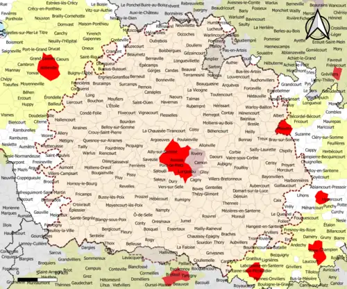 | Communes de la couronne | Somme | 355 | Acheux-en-Amiénois, Ailly-le-Haut-Clocher, Ailly-sur-Noye, Ailly-sur-Somme, Airaines, Albert, Allery, Allonville, Argœuves, Arguel, Arquèves, Arvillers, Aubercourt, Aubigny, Aubvillers, Auchonvillers, Aumont, Autheux, Authie, Authieule, Avelesges, Aveluy, Bacouel-sur-Selle, Baizieux, Barly, Bavelincourt, Bayonvillers, Beaucourt-en-Santerre, Beaucourt-sur-l'Hallue, Beaufort-en-Santerre, Beaumetz, Beauquesne, Beauval, Béhencourt, Belleuse, Belloy-Saint-Léonard, Belloy-sur-Somme, Bergicourt, Bernaville, Berneuil, Bertangles, Berteaucourt-les-Dames, Berteaucourt-lès-Thennes, Bertrancourt, Bettencourt-Rivière, Bettencourt-Saint-Ouen, Blangy-sous-Poix, Blangy-Tronville, Boisbergues, Bonnay, Bonneville, Bosquel, Bouchon, Bougainville, Bouillancourt-la-Bataille, Bouquemaison, Bourdon, Bouzincourt, Bovelles, Boves, Braches, Brassy, Breilly, Bresle, Brévillers, Briquemesnil-Floxicourt, Brucamps, Buire-sur-l'Ancre, Bus-lès-Artois, Bussy-lès-Daours, Bussy-lès-Poix, Cachy, Cagny, Caix, Camps-en-Amiénois, Canaples, Candas, Cardonnette, Caulières, Cavillon, Cayeux-en-Santerre, Cerisy, La Chaussée-Tirancourt, Chaussoy-Epagny, Chipilly, Chirmont, Chuignolles, Clairy-Saulchoix, Cocquerel, Coisy, Colincamps, Condé-Folie, Contay, Contre, Conty, Corbie, Cottenchy, Coullemelle, Courcelles-au-Bois, Courcelles-sous-Moyencourt, Courcelles-sous-Thoix, Cramont, Creuse, Croixrault, Crouy-Saint-Pierre, Daours, Démuin, Dernancourt, Domart-en-Ponthieu, Domart-sur-la-Luce, Domesmont, Dommartin, Domqueur, Doullens, Dreuil-lès-Amiens, Dromesnil, Dury, Englebelmer, Épécamps, Éplessier, Équennes-Éramecourt, Erches, Ergnies, Esclainvillers, Essertaux, Estrées-sur-Noye, Étinehem-Méricourt, L'Étoile, Étréjust, La Faloise, Famechon, Ferrières, Fienvillers, Flers-sur-Noye, Flesselles, Fleury, Flixecourt, Fluy, Folies, Folleville, Fontaine-sur-Somme, Forceville, Fossemanant, Fouencamps, Fouilloy, Fourdrinoy, Framerville-Rainecourt, Francières, Franqueville, Fransu, Fransures, Franvillers, Fréchencourt, Frémontiers, Fresnoy-au-Val, Fresnoy-en-Chaussée, Frettecuisse, Fricamps, Gentelles, Gézaincourt, Glisy, Gorenflos, Gorges, Grattepanche, Grivesnes, Grouches-Luchuel, Guignemicourt, Guillaucourt, Guizancourt, Guyencourt-sur-Noye, Hailles, Hallencourt, Hallivillers, Halloy-lès-Pernois, Le Hamel, Hamelet, Hangard, Hangest-en-Santerre, Hangest-sur-Somme, Harbonnières, Harponville, Havernas, Hébécourt, Hédauville, Heilly, Hem-Hardinval, Hénencourt, Hérissart, Herleville, Hescamps, Heucourt-Croquoison, Heuzecourt, Hornoy-le-Bourg, Ignaucourt, Jumel, Lachapelle, Lahoussoye, Laleu, Lamotte-Brebière, Lamotte-Warfusée, Lanches-Saint-Hilaire, Laviéville, Lawarde-Mauger-l'Hortoy, Léalvillers, Liercourt, Ô-de-Selle, Long, Longpré-les-Corps-Saints, Longuevillette, Louvencourt, Louvrechy, Lucheux, Mailly-Maillet, Mailly-Raineval, Maison-Roland, Maizicourt, Malpart, Marcelcave, Marestmontiers, Marieux, Meigneux, Le Meillard, Méréaucourt, Mérélessart, Méricourt-l'Abbé, Méricourt-en-Vimeu, Le Mesge, Métigny, Mézerolles, Mézières-en-Santerre, Millencourt, Mirvaux, Molliens-au-Bois, Molliens-Dreuil, Monsures, Montagne-Fayel, Montigny-sur-l'Hallue, Montigny-les-Jongleurs, Montonvillers, Fieffes-Montrelet, Morcourt, Moreuil, Morisel, Morlancourt, Mouflers, Moyencourt-lès-Poix, Namps-Maisnil, Nampty, Naours, La Neuville-Sire-Bernard, Neuvillette, Occoches, Oissy, Oresmaux, Outrebois, Pernois, Picquigny, Pierregot, Trois-Rivières, Pissy, Plachy-Buyon, Le Plessier-Rozainvillers, Poix-de-Picardie, Pont-de-Metz, Pont-Noyelles, Poulainville, Prouville, Prouzel, Proyart, Puchevillers, Querrieu, Le Quesnel, Quesnoy-sur-Airaines, Quevauvillers, Quiry-le-Sec, Raincheval, Rainneville, Remiencourt, Revelles, Ribeaucourt, Ribemont-sur-Ancre, Riencourt, Rogy, Rouvrel, Rouvroy-en-Santerre, Rubempré, Rumigny, Sailly-Laurette, Sailly-le-Sec, Sains-en-Amiénois, Saint-Acheul, Saint-Aubin-Montenoy, Saint-Fuscien, Saint-Gratien, Saint-Léger-lès-Authie, Saint-Léger-lès-Domart, Saint-Ouen, Saint-Sauflieu, Saint-Sauveur, Sainte-Segrée, Saint-Vaast-en-Chaussée, Saisseval, Saleux, Salouël, Saulchoy-sous-Poix, Sauvillers-Mongival, Saveuse, Senlis-le-Sec, Sentelie, Seux, Sorel-en-Vimeu, Soues, Sourdon, Surcamps, Tailly, Talmas, Terramesnil, Thennes, Thézy-Glimont, Thieulloy-l'Abbaye, Thieulloy-la-Ville, Thièvres, Thoix, Thory, Toutencourt, Treux, Vadencourt, Vaire-sous-Corbie, Varennes, Vauchelles-lès-Authie, Vauchelles-lès-Domart, Vauvillers, Vaux-en-Amiénois, Vaux-sur-Somme, Vecquemont, Velennes, Vergies, Vers-sur-Selle, La Vicogne, Vignacourt, Ville-le-Marclet, Villers-aux-Érables, Villers-Bocage, Villers-Bretonneux, Villers-Campsart, Villers-sous-Ailly, Villers-Tournelle, Ville-sur-Ancre, Vraignes-lès-Hornoy, Wargnies, Warloy-Baillon, Warlus, Wiencourt-l'Équipée, Yaucourt-Bussus, Yzeux. |