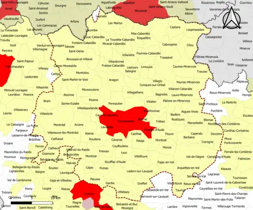 Localisation de l'aire d'attraction de Carcassonne dans le département de l'Aude. | |