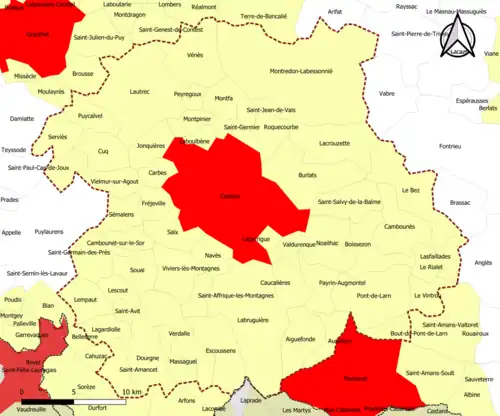 | Communes de la couronne | Tarn | 54 | Aiguefonde, Aussillon, Le Bez, Boissezon, Bout-du-Pont-de-Larn, Burlats, Cambounès, Cambounet-sur-le-Sor, Carbes, Caucalières, Cuq, Dourgne, Escoussens, Fréjeville, Jonquières, Laboulbène, Labruguière, Lacrouzette, Lagardiolle, Lagarrigue, Guitalens-L'Albarède, Lasfaillades, Lautrec, Lempaut, Lescout, Massaguel, Montfa, Montpinier, Montredon-Labessonnié, Navès, Noailhac, Payrin-Augmontel, Peyregoux, Pont-de-Larn, Puycalvel, Le Rialet, Roquecourbe, Saint-Affrique-les-Montagnes, Saint-Amancet, Saint-Avit, Saint-Germain-des-Prés, Saint-Germier, Saint-Jean-de-Vals, Saint-Salvy-de-la-Balme, Saïx, Sémalens, Serviès, Soual, Valdurenque, Vénès, Verdalle, Vielmur-sur-Agout, Le Vintrou, Viviers-lès-Montagnes. |