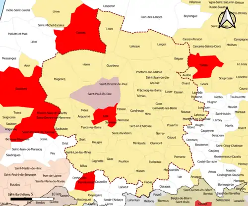 | Communes de la couronne | Landes | 58 | Angoumé, Bégaar, Bélus, Bénesse-lès-Dax, Cagnotte, Candresse, Cassen, Castelnau-Chalosse, Clermont, Estibeaux, Gaas, Gamarde-les-Bains, Garrey, Goos, Gourbera, Gousse, Habas, Herm, Heugas, Hinx, Lahosse, Laluque, Lesgor, Louer, Lourquen, Magescq, Mées, Mimbaste, Misson, Montfort-en-Chalosse, Mouscardès, Narrosse, Nousse, Oeyreluy, Onard, Ozourt, Pomarez, Pontonx-sur-l'Adour, Pouillon, Poyanne, Poyartin, Préchacq-les-Bains, Rivière-Saas-et-Gourby, Saint-Geours-d'Auribat, Saint-Jean-de-Lier, Saint-Lon-les-Mines, Saint-Pandelon, Saint-Vincent-de-Paul, Saubusse, Saugnac-et-Cambran, Seyresse, Siest, Sort-en-Chalosse, Taller, Tercis-les-Bains, Téthieu, Vicq-d'Auribat, Yzosse. |