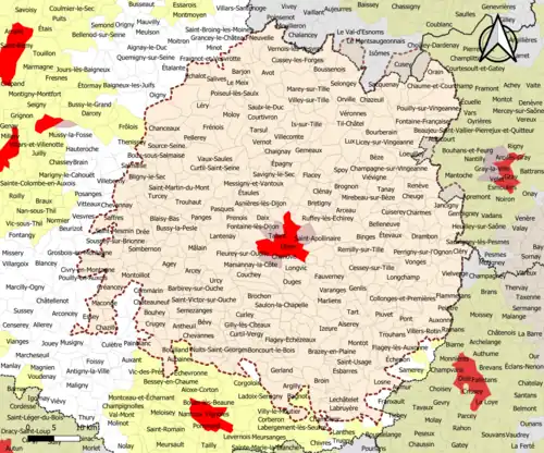 | Communes de la couronne | Côte-d'Or | 322 | Agencourt, Agey, Ahuy, Aiserey, Ancey, Antheuil, Arceau, Arcenant, Arcey, Arc-sur-Tille, Argilly, Asnières-lès-Dijon, Athée, Aubaine, Aubigny-en-Plaine, Aubigny-lès-Sombernon, Auvillars-sur-Saône, Auxonne, Avelanges, Avosnes, Avot, Barbirey-sur-Ouche, Barges, Barjon, Baulme-la-Roche, Beaumont-sur-Vingeanne, Beire-le-Châtel, Beire-le-Fort, Bellefond, Belleneuve, Bellenot-sous-Pouilly, Bessey-lès-Cîteaux, Bévy, Bèze, Bézouotte, Billy-lès-Chanceaux, Binges, Blagny-sur-Vingeanne, Blaisy-Bas, Blaisy-Haut, Source-Seine, Bligny-le-Sec, Boncourt-le-Bois, Bonnencontre, Bouhey, Bourberain, Boussenois, Brazey-en-Plaine, Bressey-sur-Tille, Bretenière, Bretigny, Brochon, Brognon, Broin, Broindon, Busserotte-et-Montenaille, Bussières, La Bussière-sur-Ouche, Bussy-la-Pesle, Cessey-sur-Tille, Chaignay, Chambeire, Chamblanc, Chambœuf, Chambolle-Musigny, Champagne-sur-Vingeanne, Champagny, Champdôtre, Champrenault, Chanceaux, Charencey, Charmes, Charrey-sur-Saône, Chaume-et-Courchamp, Chaux, Chazeuil, Chazilly, Cheuge, Chevannay, Chevannes, Chevigny-Saint-Sauveur, Cirey-lès-Pontailler, Civry-en-Montagne, Valforêt, Clénay, Cléry, Collonges-lès-Bévy, Collonges-et-Premières, Comblanchien, Corcelles-lès-Cîteaux, Corcelles-les-Monts, Couchey, Courlon, Courtivron, Couternon, Créancey, Crécey-sur-Tille, Crugey, Cuiserey, Curley, Curtil-Saint-Seine, Curtil-Vergy, Cussey-les-Forges, Daix, Dampierre-et-Flée, Darois, Détain-et-Bruant, Diénay, Drambon, Drée, Échalot, Échannay, Échenon, Échevannes, Échigey, Épagny, Épernay-sous-Gevrey, Esbarres, L'Étang-Vergy, Étaules, Étevaux, Fauverney, Fénay, Le Fête, Fixin, Flacey, Flagey-Echézeaux, Flammerans, Flavignerot, Fleurey-sur-Ouche, Foncegrive, Fontaine-Française, Fontenelle, Fraignot-et-Vesvrotte, Francheville, Frénois, Fussey, Gemeaux, Genlis, Gergueil, Gerland, Gevrey-Chambertin, Gilly-lès-Cîteaux, Gissey-sur-Ouche, Glanon, Grancey-le-Château-Neuvelle, Grenant-lès-Sombernon, Grosbois-en-Montagne, Hauteville-lès-Dijon, Heuilley-sur-Saône, Is-sur-Tille, Izeure, Izier, Jancigny, Labergement-Foigney, Labergement-lès-Auxonne, Labruyère, Lamarche-sur-Saône, Lamargelle, Lantenay, Lechâtelet, Léry, Licey-sur-Vingeanne, Longchamp, Longeault-Pluvault, Longecourt-en-Plaine, Longvic, Losne, Lux, Maconge, Magny-lès-Aubigny, Magny-Montarlot, Magny-Saint-Médard, Magny-sur-Tille, Les Maillys, Mâlain, Marandeuil, Marcellois, Marcilly-sur-Tille, Marey-lès-Fussey, Marey-sur-Tille, Marliens, Marsannay-la-Côte, Marsannay-le-Bois, Martrois, Maxilly-sur-Saône, Meilly-sur-Rouvres, Le Meix, Mesmont, Messanges, Messigny-et-Vantoux, Meuilley, Mirebeau-sur-Bèze, Moloy, Montagny-lès-Seurre, Montigny-Mornay-Villeneuve-sur-Vingeanne, Montmain, Montmançon, Montoillot, Montot, Morey-Saint-Denis, Neuilly-Crimolois, Noiron-sous-Gevrey, Noiron-sur-Bèze, Norges-la-Ville, Nuits-Saint-Georges, Oisilly, Orain, Orgeux, Orville, Ouges, Pagny-la-Ville, Pagny-le-Château, Panges, Pasques, Pellerey, Perrigny-lès-Dijon, Perrigny-sur-l'Ognon, Pichanges, Plombières-lès-Dijon, Pluvet, Poiseul-la-Grange, Poiseul-lès-Saulx, Poncey-lès-Athée, Poncey-sur-l'Ignon, Pont, Pontailler-sur-Saône, Pouilly-sur-Saône, Pouilly-sur-Vingeanne, Prâlon, Prenois, Quetigny, Quincey, Remilly-en-Montagne, Remilly-sur-Tille, Renève, Reulle-Vergy, Rouvres-en-Plaine, Rouvres-sous-Meilly, Ruffey-lès-Echirey, Sacquenay, Saffres, Saint-Anthot, Saint-Bernard, Saint-Hélier, Saint-Jean-de-Bœuf, Saint-Jean-de-Losne, Saint-Julien, Saint-Léger-Triey, Sainte-Marie-sur-Ouche, Saint-Martin-du-Mont, Saint-Maurice-sur-Vingeanne, Saint-Mesmin, Saint-Nicolas-lès-Cîteaux, Saint-Philibert, Saint-Sauveur, Saint-Seine-l'Abbaye, Saint-Seine-sur-Vingeanne, Saint-Usage, Saint-Victor-sur-Ouche, Salives, Salmaise, Saulon-la-Chapelle, Saulon-la-Rue, Saulx-le-Duc, Saussy, Savigny-le-Sec, Savigny-sous-Mâlain, Savolles, Savouges, Segrois, Selongey, Semarey, Semezanges, Sennecey-lès-Dijon, Soirans, Soissons-sur-Nacey, Sombernon, Spoy, Talmay, Tanay, Tarsul, Tart-le-Bas, Tart, Tellecey, Ternant, Thorey-en-Plaine, Thorey-sur-Ouche, Til-Châtel, Tillenay, Tréclun, Trochères, Trouhans, Trouhaut, Turcey, Urcy, Val-Suzon, Varanges, Varois-et-Chaignot, Vaux-Saules, Velars-sur-Ouche, Vernois-lès-Vesvres, Vernot, Véronnes, Verrey-sous-Drée, Verrey-sous-Salmaise, Veuvey-sur-Ouche, Vieilmoulin, Vielverge, Viévigne, Villars-Fontaine, Villebichot, Villecomte, Villers-la-Faye, Villers-les-Pots, Villers-Rotin, Villey-sur-Tille, Villotte-Saint-Seine, Villy-en-Auxois, Vonges, Vosne-Romanée, Vougeot. |