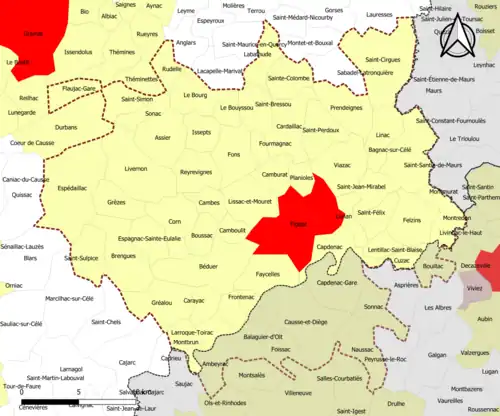 | Communes de la couronne | Lot | 50 | Assier, Bagnac-sur-Célé, Béduer, Le Bourg, Boussac, Le Bouyssou, Brengues, Cambes, Camboulit, Camburat, Capdenac, Carayac, Cardaillac, Corn, Cuzac, Espagnac-Sainte-Eulalie, Espédaillac, Faycelles, Felzins, Flaujac-Gare, Fons, Fourmagnac, Frontenac, Gréalou, Grèzes, Issepts, Labathude, Larroque-Toirac, Lentillac-Saint-Blaise, Linac, Lissac-et-Mouret, Livernon, Lunan, Montbrun, Montredon, Planioles, Prendeignes, Reyrevignes, Rudelle, Saint-Bressou, Saint-Cirgues, Sainte-Colombe, Saint-Félix, Saint-Jean-Mirabel, Saint-Perdoux, Saint-Pierre-Toirac, Saint-Simon, Saint-Sulpice, Sonac, Viazac. |