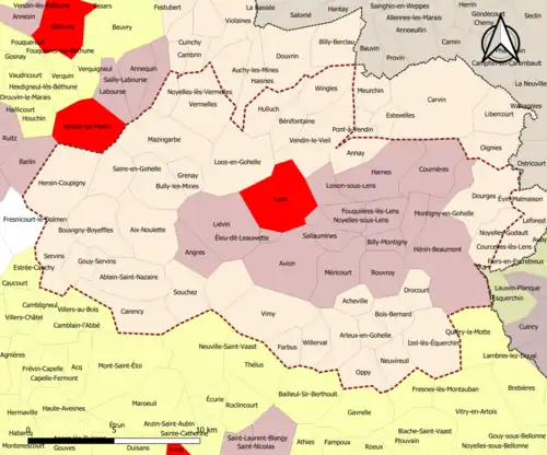 | Communes de la couronne | Pas-de-Calais | 34 | Ablain-Saint-Nazaire, Acheville, Aix-Noulette, Annay, Arleux-en-Gohelle, Bénifontaine, Bois-Bernard, Bouvigny-Boyeffles, Bully-les-Mines, Carency, Dourges, Drocourt, Farbus, Fresnoy-en-Gohelle, Givenchy-en-Gohelle, Gouy-Servins, Grenay, Hersin-Coupigny, Hulluch, Izel-lès-Équerchin, Loos-en-Gohelle, Mazingarbe, Neuvireuil, Noyelles-Godault, Noyelles-lès-Vermelles, Oppy, Sains-en-Gohelle, Servins, Souchez, Vendin-le-Vieil, Vermelles, Vimy, Willerval, Wingles. |