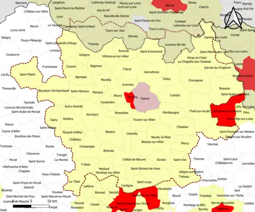 | Communes de la couronne | Allier | 57 | Agonges, Aubigny, Aurouër, Autry-Issards, Avermes, Bagneux, Beaulon, Bessay-sur-Allier, Besson, Bourbon-l'Archambault, Bresnay, Bressolles, Chapeau, La Chapelle-aux-Chasses, Châtel-de-Neuvre, Châtillon, Chemilly, Chevagnes, Chézy, Contigny, Coulandon, Couzon, Cressanges, La Ferté-Hauterive, Gannay-sur-Loire, Garnat-sur-Engièvre, Gennetines, Gipcy, Gouise, Lusigny, Marigny, Meillard, Meillers, Mercy, Monétay-sur-Allier, Montbeugny, Montilly, Neuilly-le-Réal, Neuvy, Noyant-d'Allier, Paray-le-Frésil, Saint-Ennemond, Saint-Gérand-de-Vaux, Saint-Léopardin-d'Augy, Saint-Loup, Saint-Menoux, Saint-Plaisir, Saint-Pourçain-sur-Besbre, Saint-Voir, Souvigny, Le Theil, Thiel-sur-Acolin, Toulon-sur-Allier, Treban, Treteau, Trévol, Villeneuve-sur-Allier. |