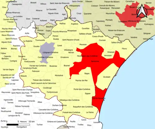 Localisation de l'aire d'attraction de Narbonne dans le département de l'Aude. | |