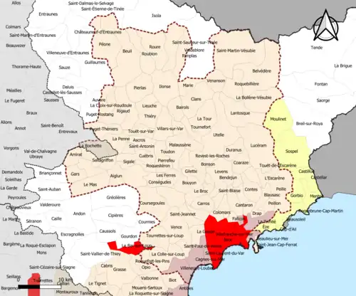 | Nombre de communes | 100 soit 98 (Alpes-Maritimes) + 2 (Alpes-de-Haute-Provence) |