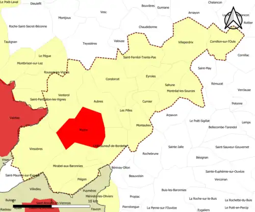 | Condorcet | 26103 | Drôme | commune de la couronne | 22,44 | 506 (2022) | 23 | |