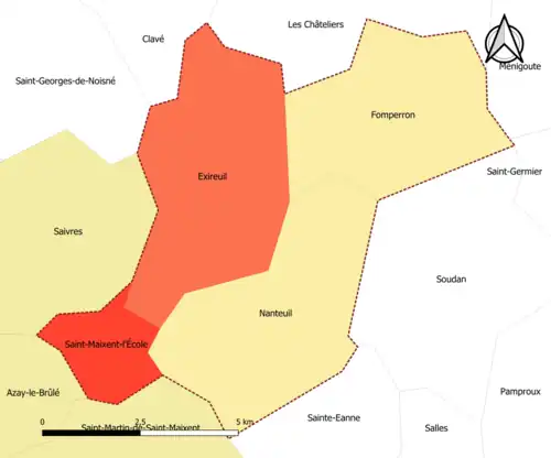 | Exireuil | 79114 | Deux-Sèvres | commune du pôle principal | 21,06 | 1 562 (2022) | 74 | |