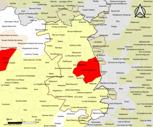 | Communes de la couronne | Marne | 38 | Argers, Berzieux, Binarville, Braux-Sainte-Cohière, Braux-Saint-Remy, Cernay-en-Dormois, La Chapelle-Felcourt, Les Charmontois, Le Châtelier, Châtrices, Chaudefontaine, Le Chemin, Courtémont, Dampierre-le-Château, Dommartin-Dampierre, Éclaires, Élise-Daucourt, Épense, Florent-en-Argonne, Gizaucourt, Maffrécourt, Malmy, Moiremont, La Neuville-aux-Bois, La Neuville-au-Pont, Passavant-en-Argonne, Rapsécourt, Saint-Thomas-en-Argonne, Servon-Melzicourt, Sivry-Ante, Verrières, Le Vieil-Dampierre, Vienne-la-Ville, Vienne-le-Château, Villers-en-Argonne, Ville-sur-Tourbe, Virginy, Voilemont. |