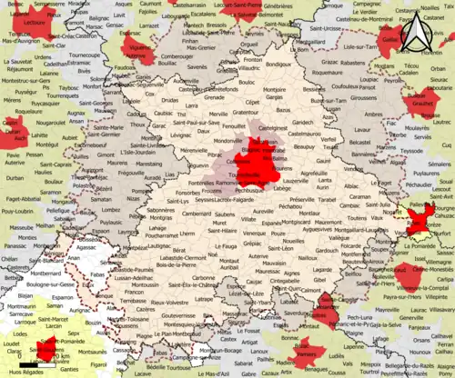 | Gers | 65 | Ardizas, Auradé, Aurimont, Beaupuy, Bézéril, Cadeillan, Castillon-Savès, Catonvielle, Cazaux-Savès, Clermont-Savès, Cologne, Encausse, Endoufielle, Escornebœuf, Espaon, Frégouville, Garravet, Gaujac, Gimont, Giscaro, L'Isle-Arné, L'Isle-Jourdain, Juilles, Labastide-Savès, Lahas, Laymont, Lias, Lombez, Marestaing, Maurens, Monblanc, Monbrun, Monferran-Savès, Mongausy, Montadet, Montamat, Montégut-Savès, Montiron, Montpézat, Nizas, Noilhan, Pébées, Pompiac, Pujaudran, Puylausic, Razengues, Roquelaure-Saint-Aubin, Sainte-Anne, Saint-Cricq, Saint-Georges, Saint-Germier, Saint-Lizier-du-Planté, Saint-Loube, Sainte-Marie, Saint-Soulan, Samatan, Sarrant, Sauvimont, Savignac-Mona, Ségoufielle, Seysses-Savès, Sirac, Thoux, Touget, Tournan. |