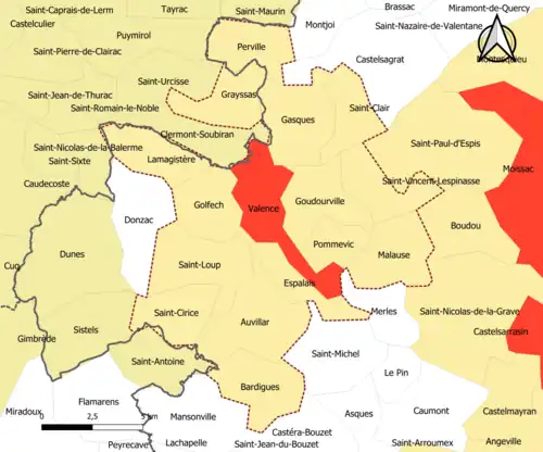 Localisation de l'aire d'attraction de Valence dans le département de Tarn-et-Garonne. | |