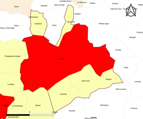 Localisation de l'aire d'attraction du Mené dans le département des Côtes-d'Armor. | |
