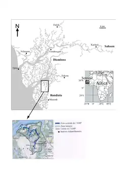 - Une aire marine centrale, essentiellement constituée par le bolon de Bamboung et ses ramifications. D’une longueur de 15 km à partir du confluent avec le Diomboss jusqu’aux vasières de la forêt de Kolé, sa superficie est d’environ trois kilomètres carrés. Sa largeur varie de 50 à 500 m et sa profondeur fluctue entre 0 et 15 m. Il présente un réseau de canaux secondaires très dense. En raison de la présence d’une nappe phréatique importante sur l’île Coco (rive est), des sources souterraines se jettent dans le bolon, réduisant ainsi localement la salinité. Ces conditions spécifiques sont susceptibles de créer un environnement favorable à la faune aquatique.