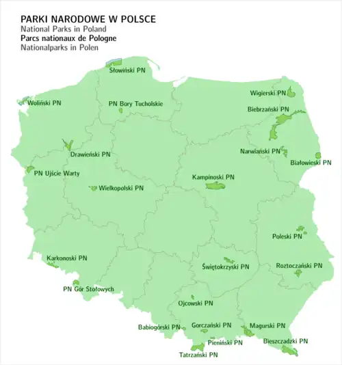 Un parc national (pl. park narodowy) polonais doit avoir une superficie supérieure à 1 000 ha (10 km²), et protéger la biodiversité et les paysages naturels. Les parcs sont ouverts au public et doivent conduire des activités de sensibilisation[1]. Autour des parcs on déclare une zone tampon. En 2017 la Pologne comptait 23 parcs nationaux couvrant 314 699,9 ha[3],[4].