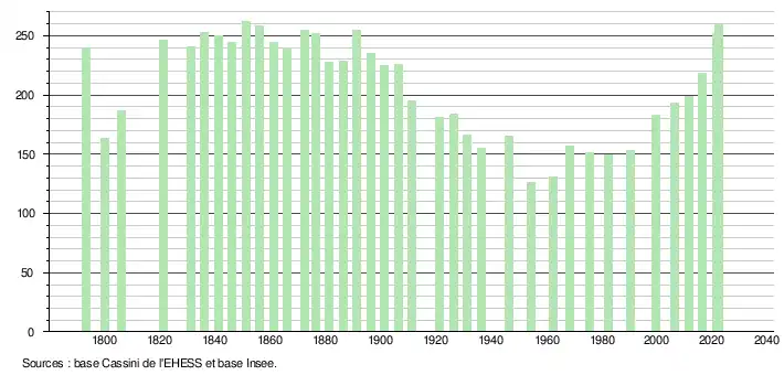 L'évolution du nombre d'habitants est connue à travers les recensements de la population effectués dans la commune depuis 1793. Pour les communes de moins de 10 000 habitants, une enquête de recensement portant sur toute la population est réalisée tous les cinq ans, les populations de référence des années intermédiaires étant quant à elles estimées par interpolation ou extrapolation[29]. Pour la commune, le premier recensement exhaustif entrant dans le cadre du nouveau dispositif a été réalisé en 2006[30].