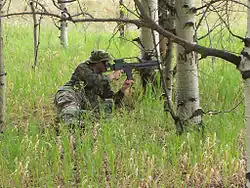 - soit sur un rail au standard 20 mm (type « Picatinny ») attaché au garde-main (rapidement détachable).