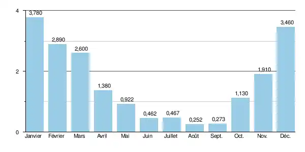 Les crues peuvent être assez importantes compte tenu de la petitesse de la rivière et de l'exiguïté de son bassin. Les QIX 2 et QIX 5 valent respectivement 20 et 26 m3/s. Le QIX 10 est de 31 m3/s, le QIX 20 de 35 m3/s, tandis que le QIX 50 n'a pas encore été calculé.